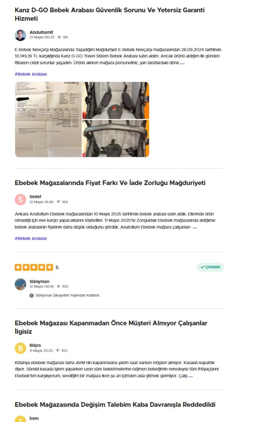 Ebebek’in Mardin, Kocaeli, Adana, Bursa, Ankara, İzmir ve İstanbul’daki mağazalarında yaşanan müşteri memnuniyetsizliği olayları, özellikle değişim, iade, ürün teslimatı ve çalışan ilgisi konularında yoğunlaşıyor. Sosyal medyada ve şikayet sitelerinde yer alan geri bildirimlere göre tüketiciler, ürünlerin ayıplı çıkması, teslimat sürelerinin aşılması, fiyat farklılıkları ve ilgisiz personel davranışları gibi nedenlerle mağdur olduklarını ifade ediyorlar.